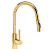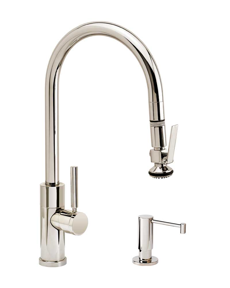 A contemporary style food prep faucet with a slight tilt. Angled spout directs water flow toward middle of larger sinks. A minimal and simplistic design that’s perfect for modern kitchen designs. Pull out hand sprayer reaches the entire sink for food prep and cleanup.